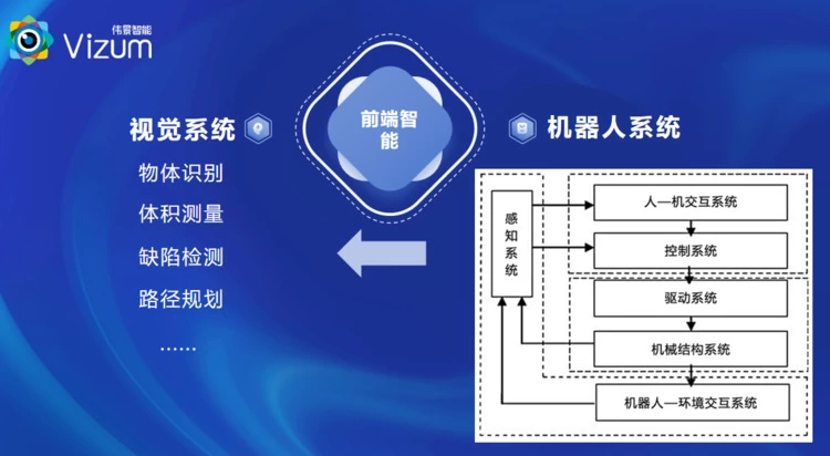 伟景智能视觉系统具备前端智能,能够自主完成物体识别、体积测量、缺陷检测、路径规划等多项功能,有效为机器人本体节省更多资源。