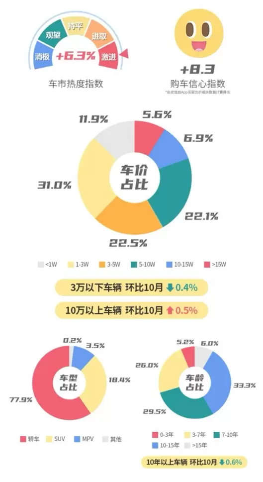 58同城·优信拍《11月二手车流通报告》显示,11月份“车市热度”与“购车信心”指数双增,环比增长分别为6.3%和8.3%,弥补了10月因长假等因素造成的影响,同时年终二手车批售市场正在重回正增长通道。11月份二手车流通情况方面,1-3万车价占比最高达到31.0%,3-5万车价占比紧跟其后,为22.5%;轿车仍为大众首选车型,占比为77.9%;车龄10-15年虽然占比最高为33.3%,但环比10月小幅下跌0.6%,7-10年的占比次之,为29.5%。