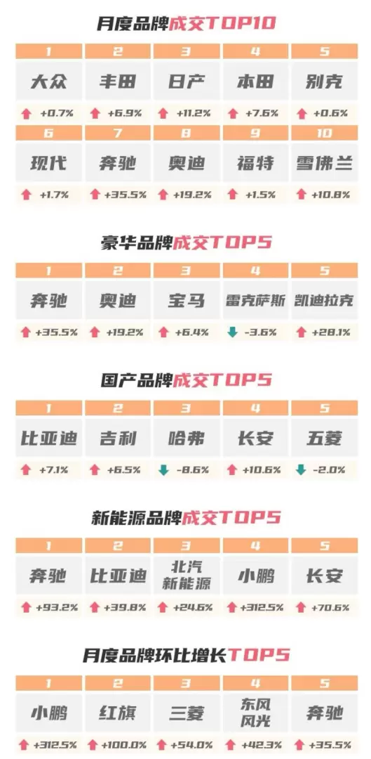 月度品牌成交方面,58同城·优信拍统计显示,11月品牌榜单整体上升趋势明显。特别是奔驰和奥迪,增幅明显,排名有所提升。豪华品牌榜单中,只有雷克萨斯持续下滑,与目前市场新车价格波动有关,国产品牌中,哈弗连续两个月环比下降;新能源榜单方面,奔驰连续两个月增幅近100%,小鹏增幅超300%。