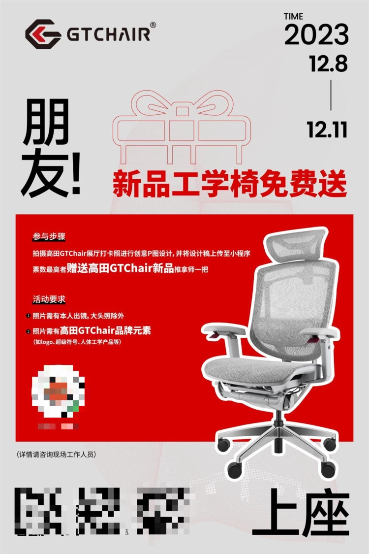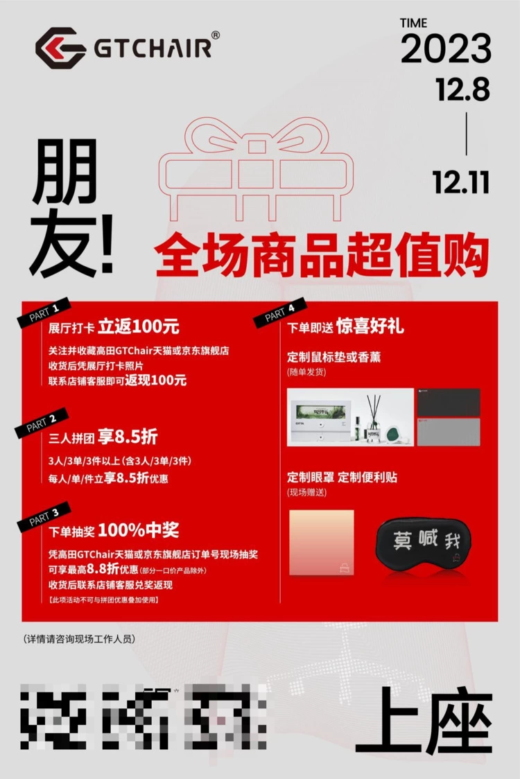 关注收藏高田GTChair天猫/京东旗舰店,收货后可凭展厅现场打卡照片,享受返现100元优惠!