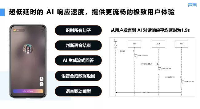 针对目前市面上大多数 AI 生成式对话响应慢的问题,声网对 AIGC 场景下音视频互动的延时做了很多技术优化,从用户发言到 AI 对话响应平均延时仅为 1.9s, 而市场上绝大部分 AI 互动延迟还停留在 6-7s。