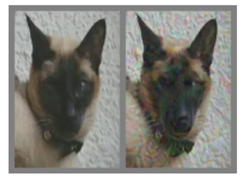 如上图所示,机器模型和人类都会判断左侧是猫,而右侧是狗,即使我们仔细观察可能也会得出相同的结论。而事实上右侧图像只是左侧图像一个简单地对抗扰动。
