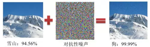 研究者发现:通过向真实样本中添加人眼不可见的噪声,就会导致深度学习模型发生预测错误,把原本是雪山的图片误认为是狗。