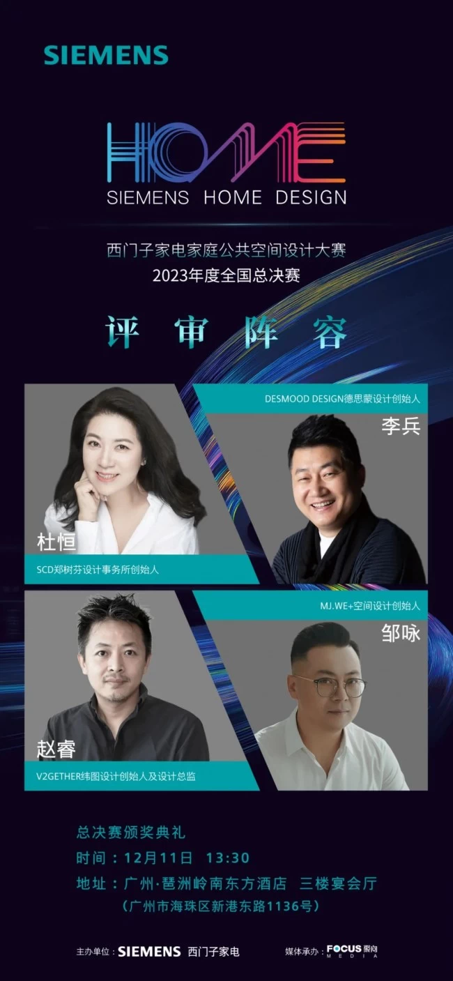 经过选手们精彩角逐,三大分赛区的冠军、亚军、季军、梦想之星奖以及未来之星奖获得者直接晋级至2023年度全国总决赛,以设计作品进行最终对决。延续专业赛事原则,总决赛将特邀四位行业资深人士组成总决赛评审团,包括SCD郑树芬设计事务所创始人杜恒、DESMOOD DESIGN德思蒙设计创始人李兵、V2GETHER纬图设计创始人及设计总监赵睿,以及MJ.WE+空间设计创始人邹咏。四位业界翘楚将严格按照标准进行综合打分,评选出独具设计巧思、蕴含无限创意的家庭公共空间设计方案,对参赛者不断突破的设计才华与创新能力表以肯定。