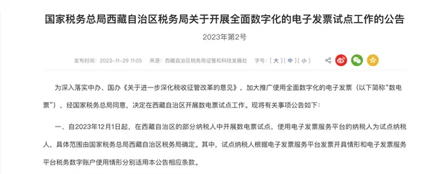 上周,国家税务总局西藏自治区税务局发布《关于开展全面数字化的电子发票试点工作的公告》,于12月1日起正式实施。从2021年12月1日上海、广东、内蒙古三地正式开始进行数电票的推广,历经两年,全国36个税区已经全部覆盖数电票收票与数电票开票的试点。