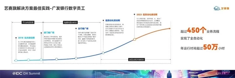 吴鑫演讲中向我们分享了广发银行在超自动化领域的实践。艺赛旗作为国内超自动化解决方案领先提供商,基于与广发银行的多年紧密合作关系,利用其在金融行业十余年的数字化实践经验,为广发银行提供了有力的技术支持,助力广发银行建立了一个覆盖全国范围的超自动化管理平台,深度融合了流程挖掘和RPA工具,实现了业务流程自动化管理的完整闭环。