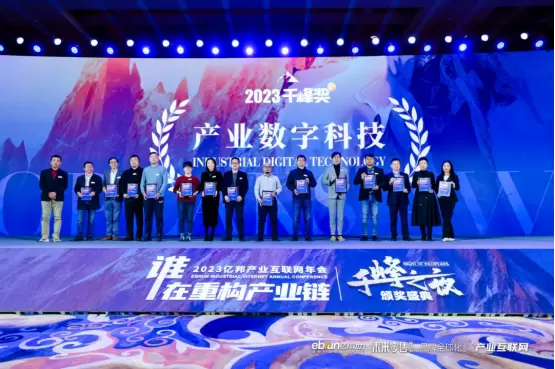 2023年12月1日晚,由亿邦动力主办的2023亿邦互联网年会暨2023年度产业互联网千峰之夜在上海圆满落下帷幕,在一百余位产业互联网企业决策人、投资人及业界人士的共同见证下,大会现场揭晓了本年度千峰奖获奖企业名单。