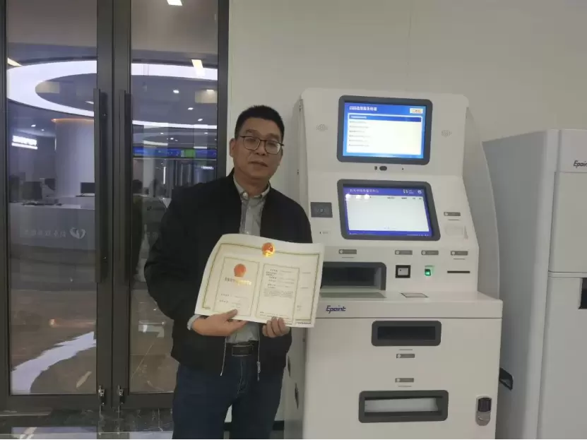 市民李先生在政务服务中心一楼制证中心大厅内的自助一体机旁自助领证