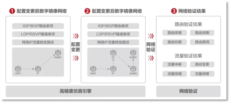 云网预知系统基于华为网络数字地图内生高精度仿真框架,实时在线生成高精度镜像网络,以网络设备的变更配置、互联路由与流量作为输入,模拟网络协议、流量的状态和行为,仿真网络设备的路由表与转发表项,为网络变更风险评估提供真实、客观的基础数据。