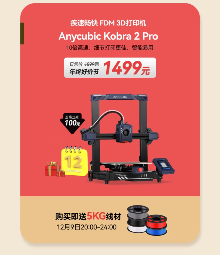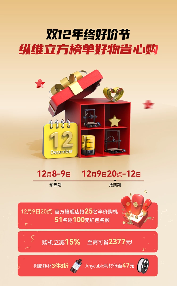 伴随着双12的取消,取而代之的“淘宝年终好价节”也拉响了年终最后一场大促的号角,不少科技爱好者、手工达人都计划趁着年前给自己购置一款创意“年货”。作为国内消费级3D打印领域巨头的纵维立方也没让大家失望,在这场年终盛典中为消费者们带来了同样实惠的购机福利!12月9日20点在其天猫、京东旗舰店共有25个半价购机、51个返百元红包福利,还有多款明星产品享直降优惠和丰厚赠品!