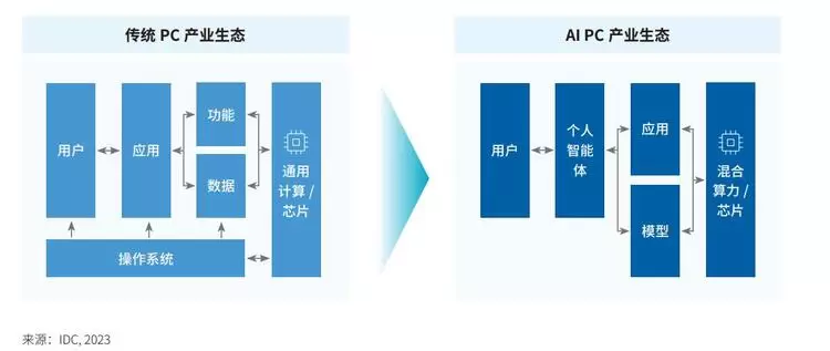 具体而言,AI PC将不仅是硬件设备,而是一个包含AI模型和应用以及硬件设备的混合体。相比传统PC产业生态以操作系统为基础, AI PC产业生态,以基于自然语言交互的个人智能体为第一入口,通过大模型与应用生态的支持,完成用户端提出的任务。