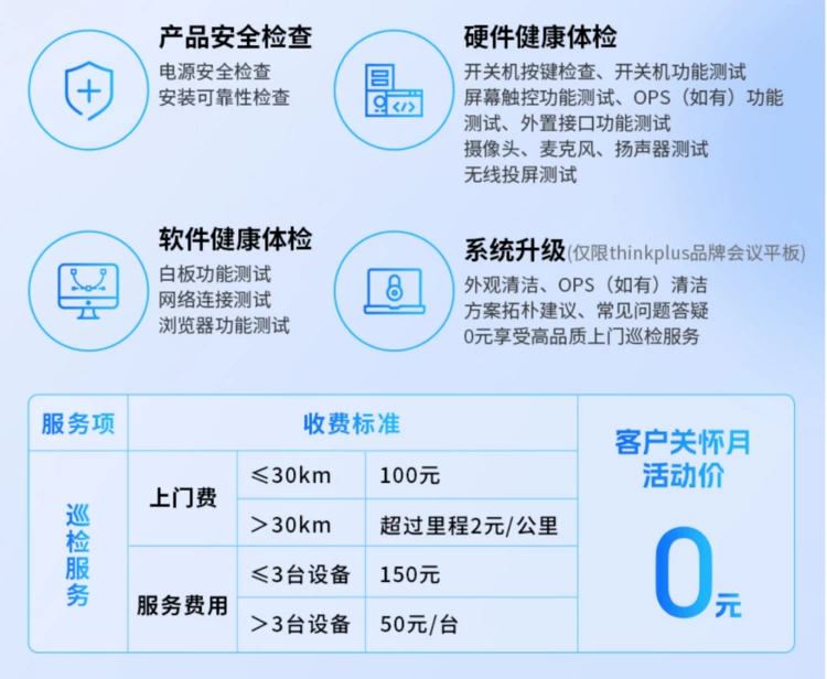 为了持续打造卓越的服务体验,夯实thinkplus会议平板服务品质和客户口碑,联想 thinkplus决定在2023年12月再次启动这一活动,专业售后工程师团队将在北京、深圳、上海、广州、杭州、长沙、武汉、西安、成都、郑州、南京、济南、沈阳、太原和东莞15个城市展开免费上门巡检服务。本次活动不仅覆盖了联想 thinkplus 会议平板全系列产品,还覆盖其他各品牌会议平板产品,只要您是会议平板的使用用户,报名并审核通过,即可免费享受价值¥249起的专业巡检服务,该服务自报名成功次日起至2024年1月15日内有效。