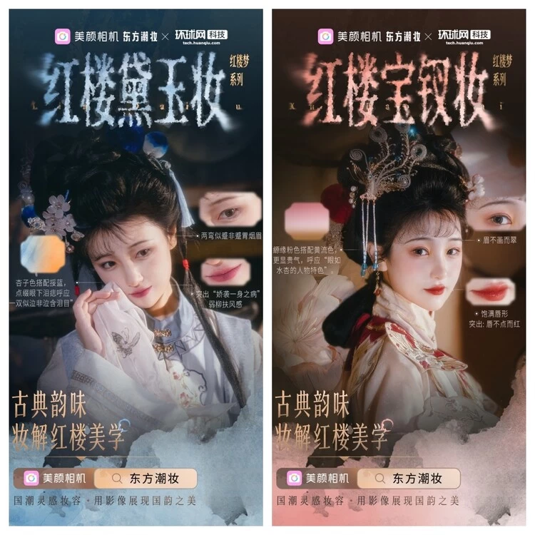 大会现场,美颜相机也开展了以影像科技传承中国优秀传统文化的创新尝试,以《红楼梦》为蓝本设计,打造了“东方潮妆“红楼系列妆容,包括红楼黛玉妆和红楼宝钗妆。