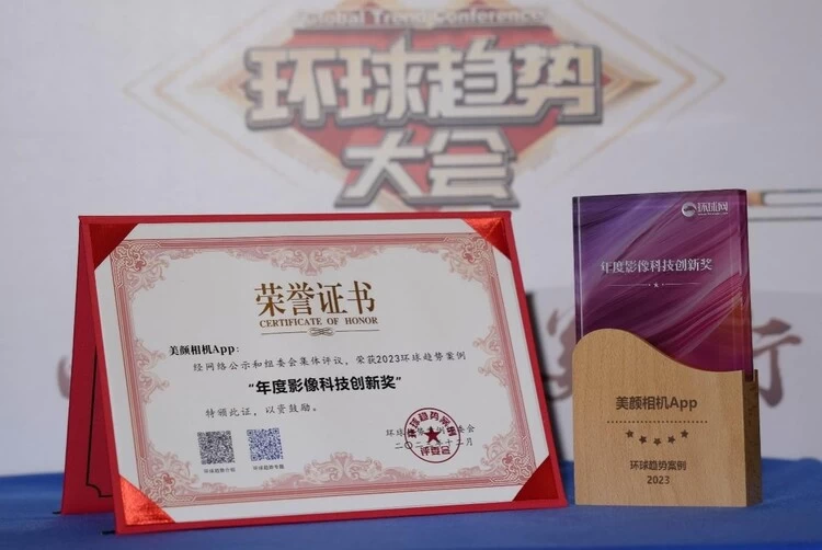 在近日举办的第五届环球趋势大会上,组委会向美颜相机颁发了2023年度影像科技创新奖,以表彰美颜相机在2023年在AIGC产品创新和文化出海等层面的优异表现。