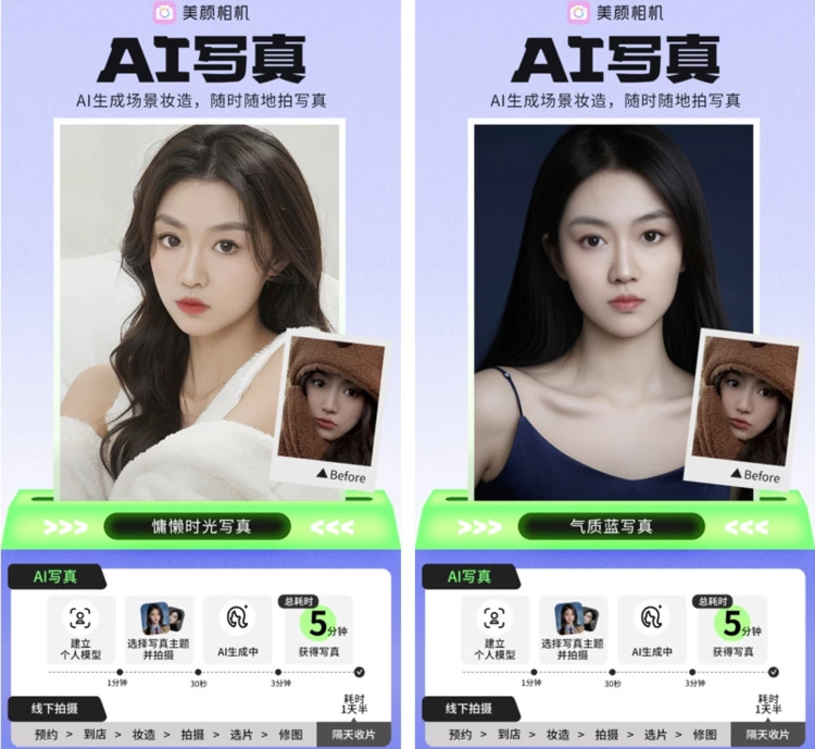 在AI的助力下,美颜相机还在重构拍照场景,革新拍照方式。如AI写真,将原本需要一天才能完成的写真流程缩短5分钟之内,将妆造、置景、灯光、精修等完整巧妙地融合于技术当中,大大提升了影楼写真的生产效率。