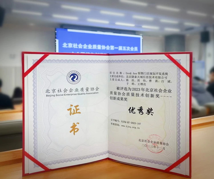 近期,GeoQ Ana智图门店规划开发系统获得“2023年北京社会企业质量协会质量技术创新奖”,该奖项由北京市民政局下辖北京社会企业质量协会,组织了质量技术专家、科研机构、行业组织、知名企业等领域专家学者组成的专家评审组评选而出。