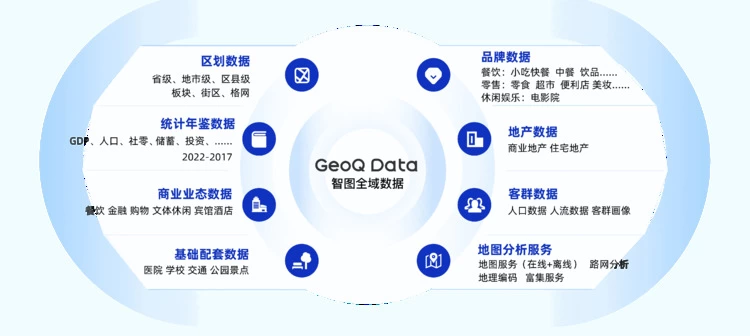 内置覆盖全国363个地级市,2800多个区县的标准地理数据库,包括:路网导航、地理编码、POI兴趣点、人口客流、地产、交通、品牌、街区等数据内容。用户可在产品中按需接入使用,进行市场环境评估、商圈分析、门店选址等业务应用。
