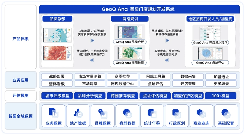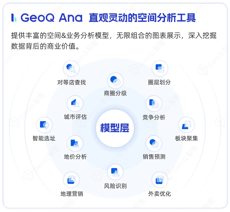 GeoQ Ana智图门店规划开发系统依托覆盖全国5亿+全域商业位置数据,通过大数据、空间分析与业务场景的深度融合,可应用于零售、餐饮、地产、金融、保险、汽车等多个行业,为各个行业企业提供战略规划、商圈推荐、门店选址、投资决策、经营管理、风险管控、城市和消费者洞察等核心功能,助推企业数字化转型、提高开店和管理效率,提升开店质量,同时可以更好地控制开店风险,驱动业务快速稳健增长。