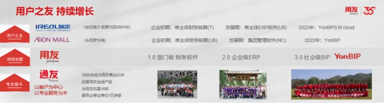用友自1988年成立以来,一直专注于信息技术在企业与公共组织的应用和服务领域,通过持续创新的产品、与各类生态伙伴的合作为无数客户创造价值,共同推进了产业的进步发展。