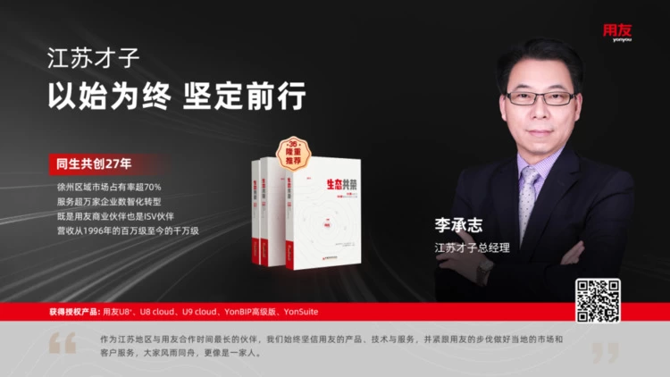 作为江苏地区与用友合作时间最长的伙伴,李承志及其团队亲历了用友1.0时代、2.0时代和3.0时代,在采访最后,他用两个关键词概括了他对用友的满腔深情:一是信任。他对用友产品、技术与服务的信任,近乎信仰,不容任何置疑。二是感恩。在他心里,才子与用友从来就不是代理与被代理的关系,大家更像是一种家人关系。“我们有什么事、有什么想法都会跟他们说,他们也总是不怕麻烦不计得失地提供帮助,共同的事业将我们牢牢地连结在一起。”