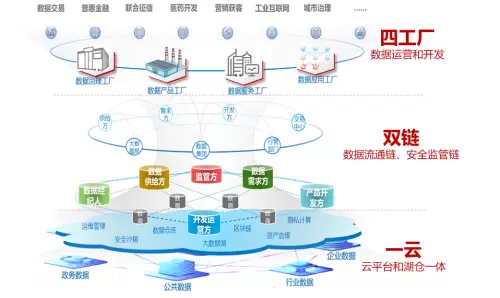 “四工厂”包括支撑数据质量提升的数据治理工厂、支撑数据价值提升的数据产品工厂、支撑数据共享流通的数据服务工厂和支撑数据价值呈现的数据应用工厂,四位一体支撑数据要素高效运营和开发利用。