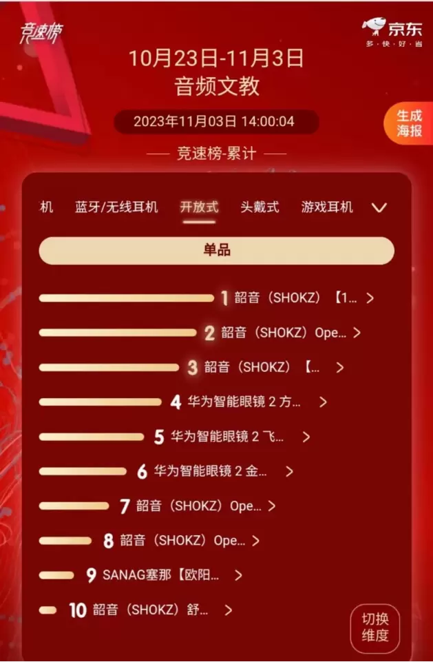 在前段时间的双十一中,依靠着强大的品牌知名度和极佳的用户体验,韶音不仅拿下开放式耳机明星品牌之冠的荣誉。同时,不入耳系列的OpenFit舒适圈和专业运动系列的OpenRun Pro也顺理成章包揽开放式耳机明星单品前二,更是所有品牌中唯一有两款产品入围的品牌。甚至,在京东双11开始的前12天(10.23-11.3)内,京东音频竞速榜中的“开放式耳机”品类,Shokz韶音包揽前三,前10名中上榜产品更是多达6款,显示出在开放式耳机品类强大的统治力和压倒性的优势。