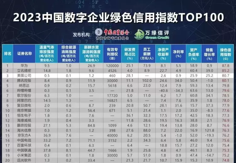 《2023中国数字企业绿色信用指数TOP100报告》由中国投资协会投资咨询专业委员会与万绿信评共同编制,从绿色低碳、社会责任和财务信用三大方面评估,涉及碳排放、能耗、大气污染物、水资源、环保投入、研发能力、公益投入、员工福利、盈利能力、资产质量、债务风险和经营增长等多项指标。