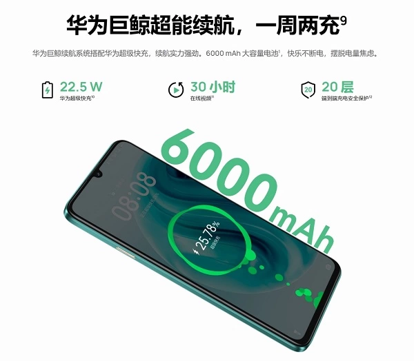 值得一提的是,华为畅享70内置一块6000mAh华为巨鲸电池[1],不仅可以满足全天的使用需求,对于非重度用户甚至可以保持一周两充的极致续航表现,彻底解决了智能手机普遍存在的续航焦虑问题。另外,华为畅享70还支持22.5W华为超级快充[2],带来更高效的充电效率,在日常使用过程中,更加从容不迫,安心无忧。通过AI节电技术、智能充电管理等多重智能充电技术,在带来超长待机续航的同时,守护用户的充电安全,智能可靠。