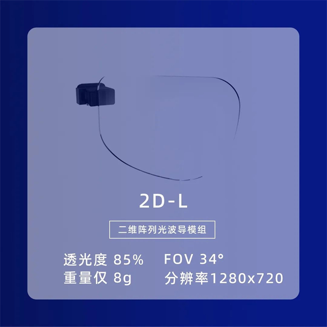 参数方面,2D-L重量仅为8.5g,其采用了具备高亮显示的LCOS方案,成像画面支持1280x720分辨率全彩显示,得益于二维扩瞳技术的加持,其视场角达到34°且光机体积仅有2cc,这是目前大多数一维波导无法达到的,它的入眼亮度可达2500nit,MTF>0.6,这意味其即便是在白天户外也不会存在亮度问题。