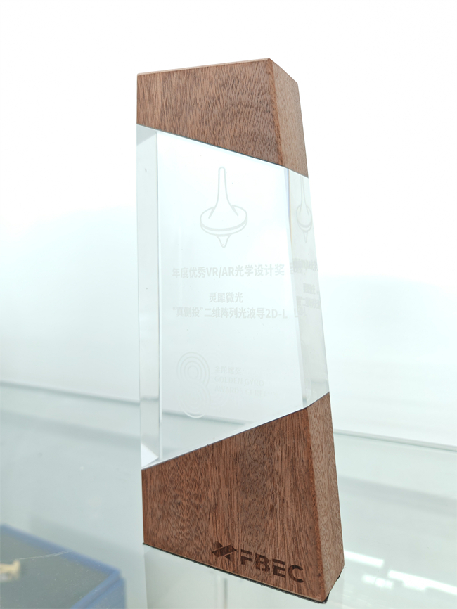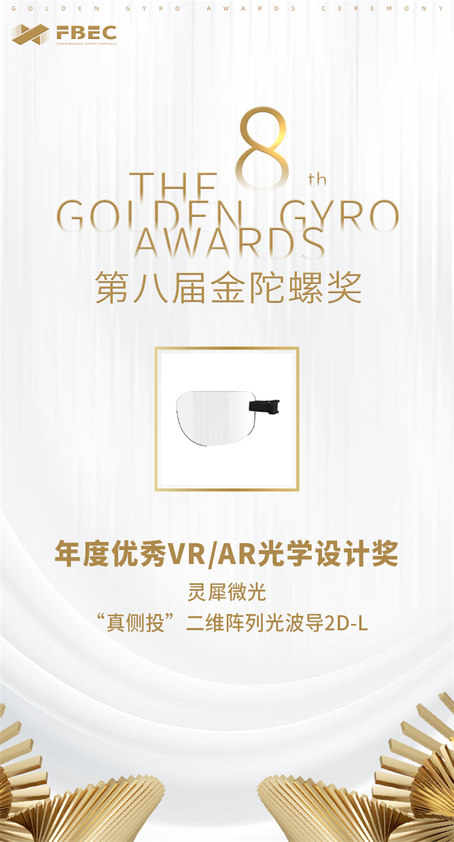 12月8日,2023未来商业生态链接大会暨第八届金陀螺奖(简称“FBEC 2023”)在深圳大中华喜来登酒店落下帷幕,灵犀微光“‘真侧投’二维阵列光波导2D-L”光学模组项目荣获年度优秀VR/AR光学设计奖。