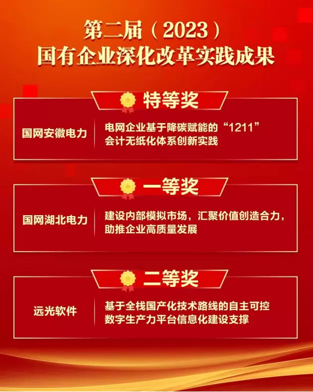 近日,中国管理科学学会和《企业家》杂志社联合发布了第二届(2023)国有企业深化改革实践成果,活动旨在遵循党中央的指示、落实国务院国资委“国有企业改革深化提升行动”要求,总结提炼出一批有影响力的标志性成果,并积极探索建立成果共享与转化机制,进而推动国有企业高质量发展。由“远光软件”数字生产力平台上打造的国网安徽电力、国网湖北电力的两项成果分别获得特等奖和一等奖,远光公司的平台本身也有幸获奖。