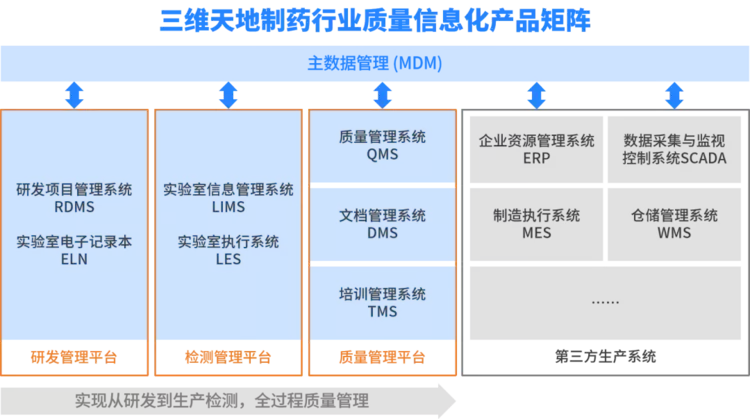 三维天地TQM遵循当前主流管理思路,基于云计算和大数据技术,汇集RDMS、LIMS、QMS的业务管理功能与质量管理功能,构建出一套完整的质量数据管理平台,为企业质量大数据的整体规划填补研发端、生产质控端、质量保证端的数据资源空缺,并通过业务功能提升研发、检测和QA工作合规性与效率,确保质量大数据源头输入的数据质量与流转效率。