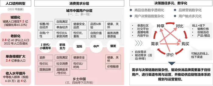 居民消费水平的波动驱动着消费趋势、消费心理的变革,而数字经济的持续深化发展则推动着消费渠道的拓展。同时,疫情的余波仍然对市场发展、消费趋势、渠道变化发挥作用。居民的消费回归理性,商品与内容平台则为用户提供了充足、全面的决策信息,延长了消费者的决策链路,也推动着品牌商从客户(用户)结构的角度探索差异化商品需求与触达策略,使得用户需求进一步分化。