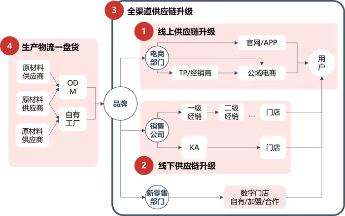 从线下供应链的环节来看,品牌线下供应链管理面临,如何在维持渠道交易结构、稳定价盘、货盘的基础上,提升渠道动销水平、交易效率提升的挑战。