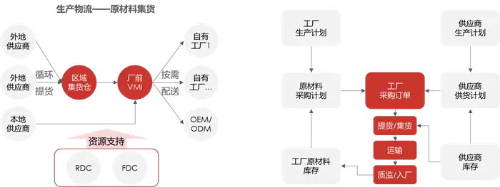 品牌可以基于工厂的原材料供应需求,供应商体系,整合入厂物流需求,依托流通体系深度仓网,打造生产环节的“区域集货+入厂配送”,在一定程度上,提升仓网利用效率、优化生产物流成本与交付效率,并进一步赋能OEM/OEM工厂。