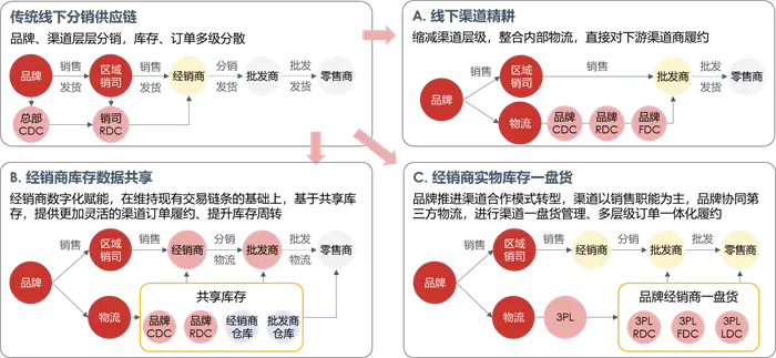 传统线下分销供应链的升级路径有多个方向,当前,品牌商的线下供应链转型可以分为三种:渠道精耕、经销商库存数据共享、经销商实物库存一盘货。
