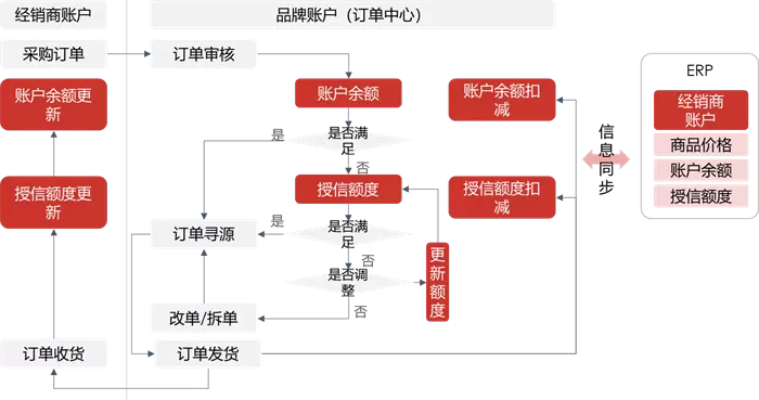 在数字化框架中,企业可以建立多层级账户体系,实现品牌、多级经销商之间的订单、库存数据共享,支持创新履约场景下的经销商利益保障。并同步ERP进行经销商的账户余额、授信额度管理,基于销售订单进行余额、授信扣减。