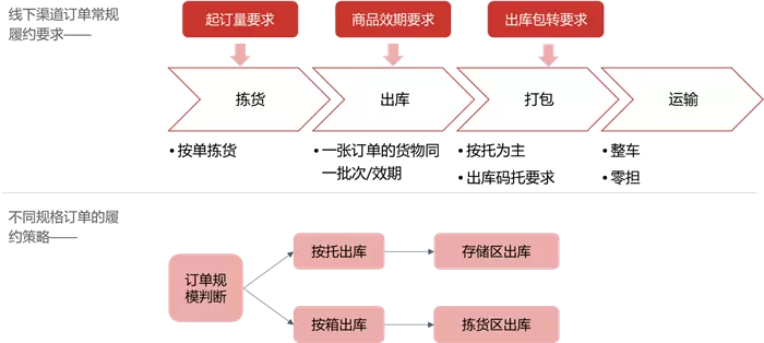 对于线下供应链,快消品to B的订单履约中,渠道商更加关注商品效期,一般要求同一张订单的商品时效一致,而非先进先出等原则。同时,to B订单的碎片化,驱动品牌商在库内作业流程上,采取更加灵活的方式。