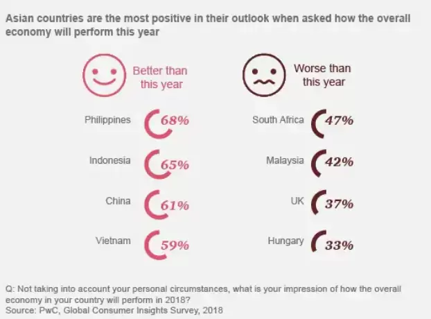 亚洲地区往往最乐观,可能是因为中国和亚洲几个新兴经济体的GDP持续增长。事实上,对本国经济表现持最乐观态度的四个地区都来自亚洲:菲律宾、印尼、中国和越南。