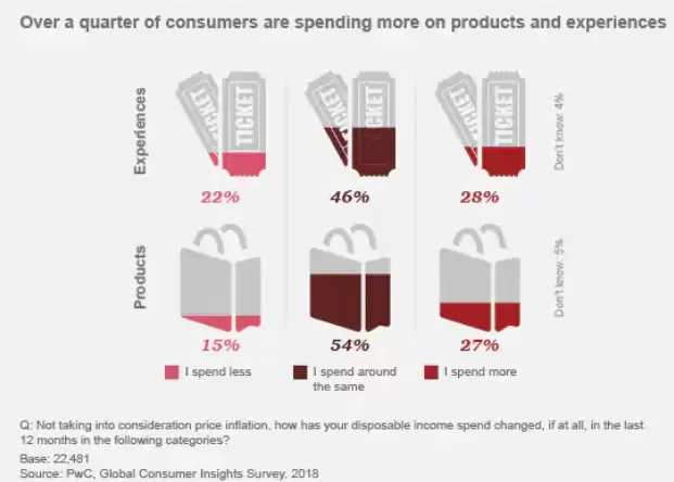 在我们询问的问题中,我们询问了12个月里受访者的可支配收入支出习惯在以上两个类别上发生了怎样的变化。28%的人在体验上花费更多,27%的人在产品上花费更多。46%的人在体验上花费相同,54%的人在产品上花费相同。另一种迹象表明,绝大多数人对自己继续购买额外产品和体验的能力充满信心。