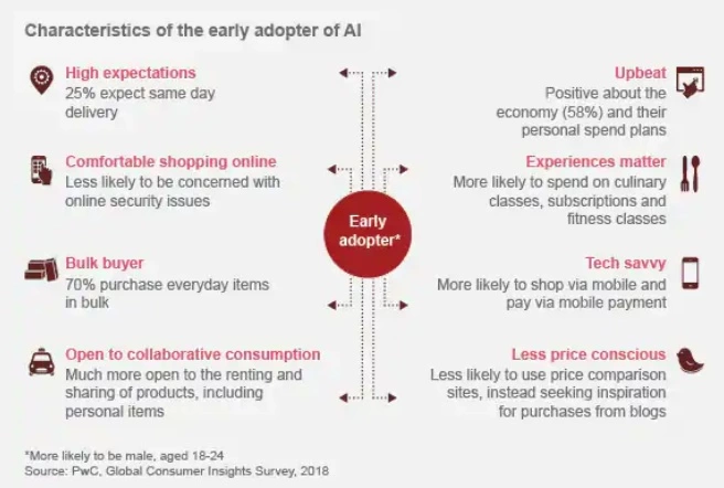 总之,持有乐观和高期望态度的消费者最有可能使用AI。我们查看了我们的数据,用几种不同的方法得出了一个早期采用人工智能的用户的简介。他们是18-34岁的男性,对经济和个人支出都持积极态度,更喜欢移动支付,愿意合作消费和大量购买。这些高期望从何而来?其中25%的受访者希望按规定当日交付产品。