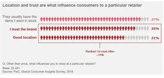 除了价格之外,我们询问消费者哪些因素会影响他们选择特定的零售商。超过三分之一(35%)的人将“对品牌的信任”列为三大原因之一。