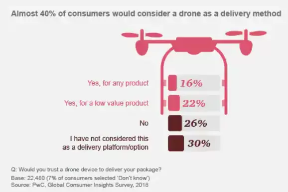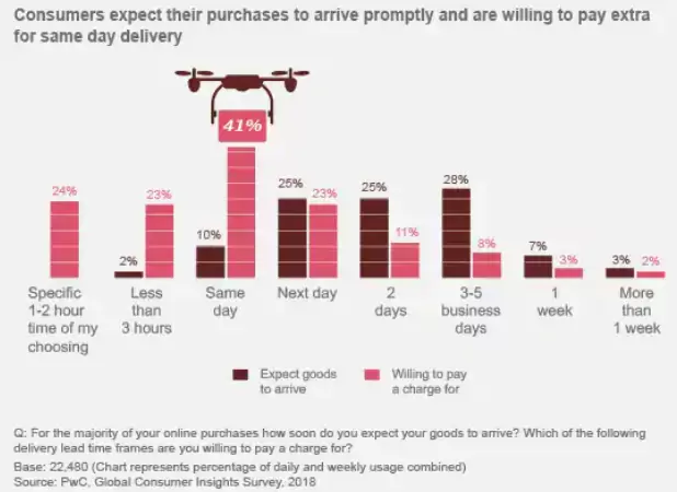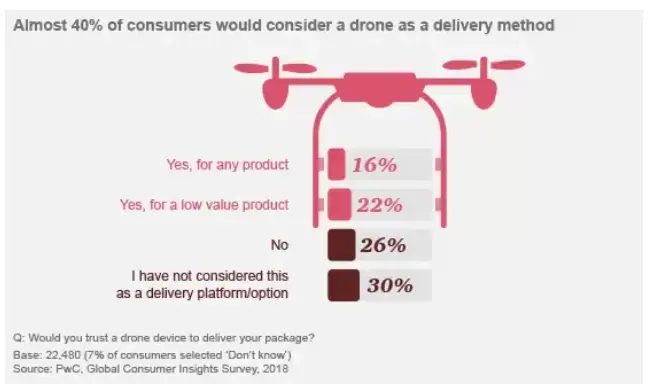调查发现,购物者更关心的是发货方式和速度,而不是实际发货方。超过三分之一的受访者表示,他们会考虑使用无人机送货。
