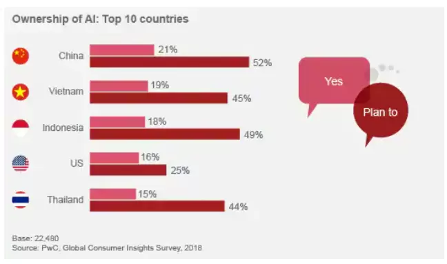 对语音交互的普遍偏好以及对网络隐私的较低担忧,让许多亚洲国家紧随其后。在中国,超过一半(52%)的人计划购买一台AI设备。越南(19%拥有,45%计划持购买)、印度尼西亚(18%拥有,49%计划购买)和泰国(15%拥有,44%计划购买)的情况类似。