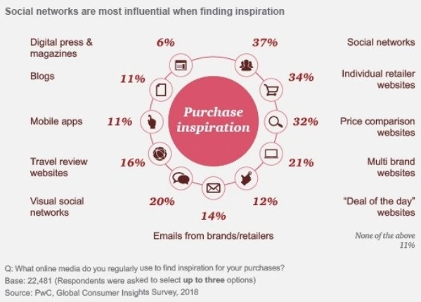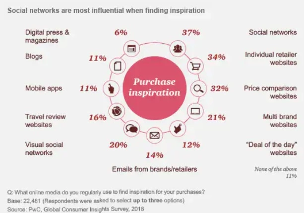 虽然对品牌的信任在决定消费者在哪里购物方面起着重要作用,但他们在很大程度上依赖于其他人的意见来决定买什么。社交网络在他们经常用来寻找购物灵感的在线媒体中排名第一(37%的受访者的选择)。中国受访者再次脱颖而出,他们对社交网络的偏好飙升至52%。