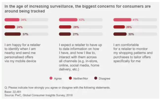 在很大程度上,我们的调查对象似乎相信零售商会收集他们互动的数据,并利用这些信息提供个性化的服务。超过40%的受访者表示,他们很乐意让零售商监控他们的购物模式和购买情况,并希望零售商能掌握他们如何通过各种渠道(包括在商店、网络和社交媒体上)与之互动的最新信息。
