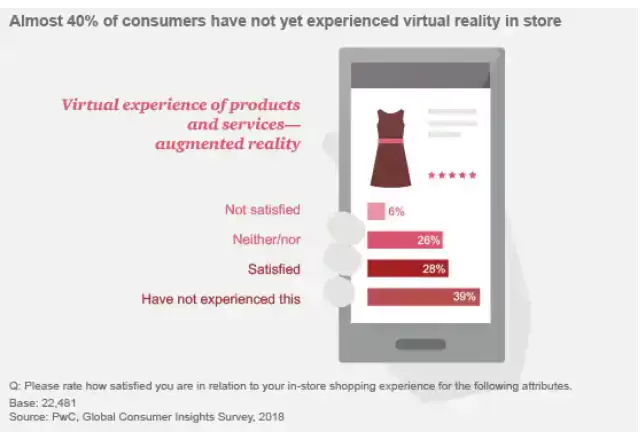 雄心勃勃的零售商可以更进一步提供虚拟现实,但这种趋势仍在缓慢发展。超过三分之一的受访者仍未在商店中体验过这种技术,而在那些体验过的受访者中,只有略多于一半的人感到满意。