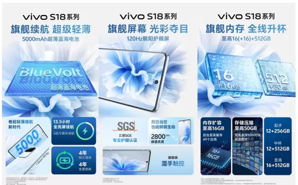 这一次,vivo S18系列将借助超薄蓝海电池带来的技术优势,实现大容量电池和轻薄机身的兼得,使得新机在续航和便携性方面达到新的高度;新机将采用120Hz朝阳护眼屏,峰值亮度可达2800nits;全系至高16+512GB,内存支持至高扩容16GB,存储空间支持至高扩容50GB,实现后台至高同时保留49个应用,多存10000张高清图片;性能方面,vivo S18将采用高通第三代骁龙7,而vivo S18 Pro则会搭载具有旗舰性能表现的天玑9200+芯片,后者跑分可达158万+,为用户提供了更出色的性能体验。