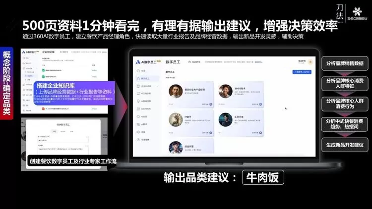 通过搭建企业知识库,创建餐饮行业专家工作流程,360AI数字员工在快速读取大量行业报告及品牌经营数据后迅速成长为行业专家,有理有据输出新品品类建议——牛肉饭。
