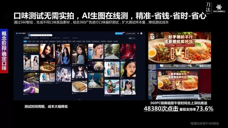 通过AI生图工具——360智绘,无需拍摄成品实物图即可生成不同口味菜品素材。借助360在PC端的强势流量优势, 以360PC锁屏画报为主要阵地,在午饭时段触达北、上、深、杭职场办公人群进行口味偏好测试,不仅扩大了测试样本量,同时也降低测试成本。